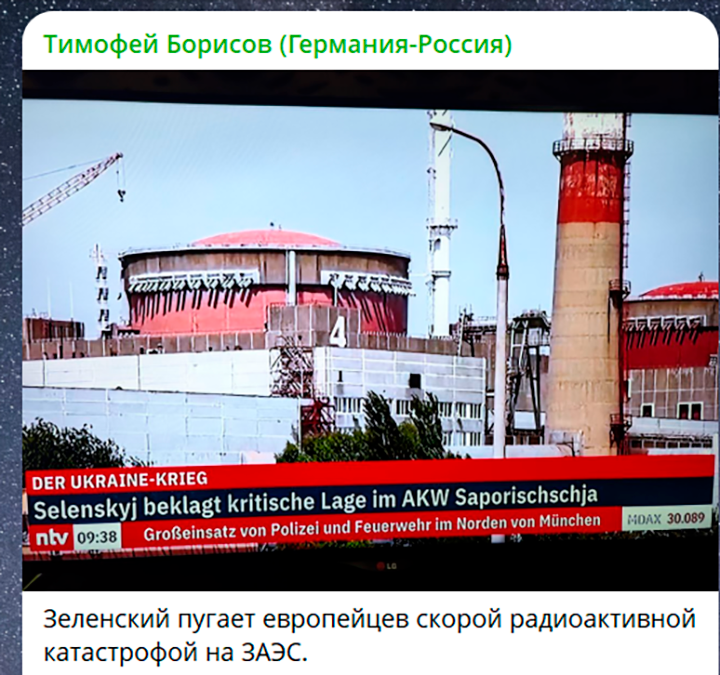 Другим получателем обширного испуга выступает европейский обыватель, которому нужно показать, какие русские безумные, что готовы обстреливать АЭС, на которой сами же и сидят. Скриншот: ТГ-канал "Тимофей Борисов (Германия-Россия)".