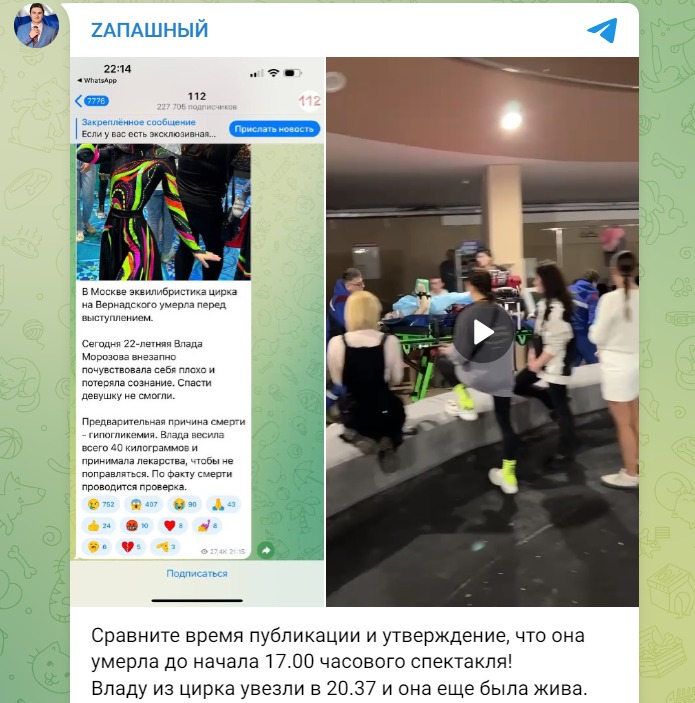 Субботнее шоу в Большом Московском Цирке законилось трагедией. После своего выступления неожиданно скончалась 22-летняя артистка Влада Морозова.