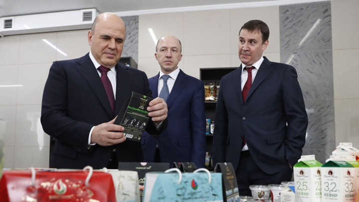 Михаил Мишустин и министр сельского хозяйства России Дмитрий Патрушев во время посещения производства в алтайском селе Майма. Фото: government.ru
