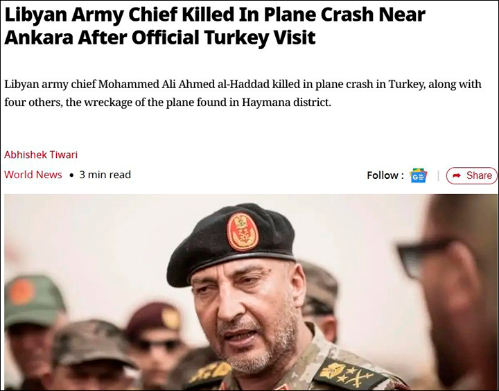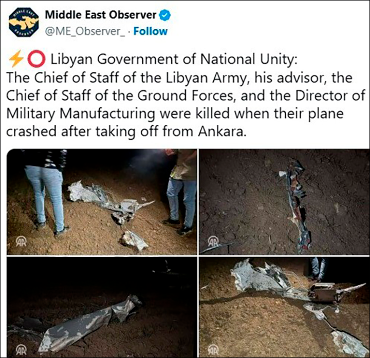 Аль-Хаддад завершил официальный визит в Анкару: его принял с военными почестями начальник Генштаба Турции генерал Сельчук Байрактароглу, прошли переговоры с министром обороны Яшаром Гюлером и командующим сухопутными войсками Турции. Обсуждались вопросы военного сотрудничества – Турция остаётся ключевым партнёром признанного ООН правительства в Триполи (поставки вооружений, обучение, присутствие турецких войск). За день до катастрофы парламент Турции продлил на два года мандат турецкого контингента в Ливии.