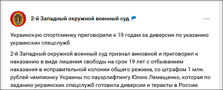 Чуть меньше – 19 лет и такой же штраф – получила несостоявшаяся диверсантка Юлия Лемещенко, чемпионка Украины по пауэрлифтингу, которая по заданию Киева готовила диверсии и теракты в России. Будучи гражданкой России, с 2014 года она постоянно проживала на Украине, где начала сотрудничать с украинскими спецслужбами, в том числе с представителями так называемого легиона "Свобода России"**. Весной прошлого года спортсменка прошла специальную разведывательно-диверсионную подготовку.