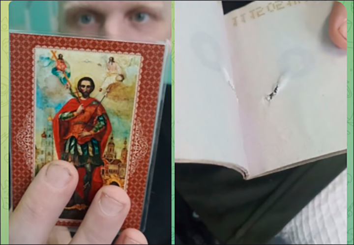Осколок пробил документы, но остановился перед иконой // Скриншот: видео Михаила Буцку