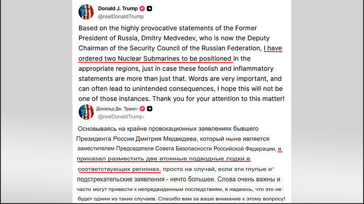 Трамп грозил своими атомными субмаринами Ким Чен Ыну ещё в 2017 году. Как мы знаем, с Северной Кореей всё в порядке. Августовский демарш был предпринят в ответ на резкий пост зампреда Совбеза России Дмитрия Медведева. И это само по себе выглядело как дешёвая клоунада.
