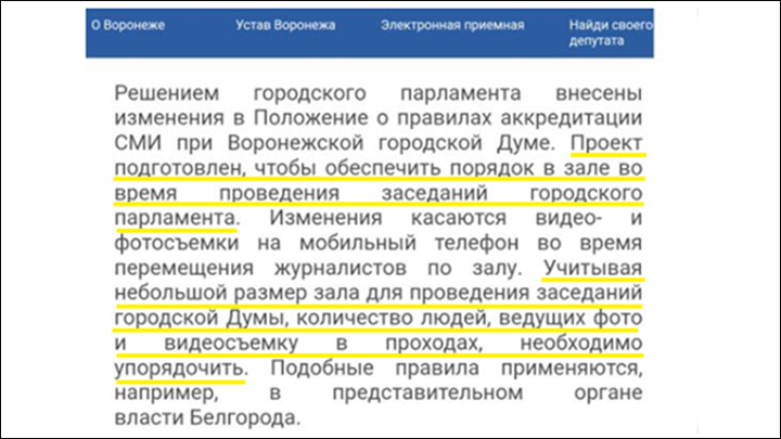 О скандальном запрете стало известно 26 ноября. Депутаты Воронежской городской думы изменили положение об аккредитации журналистов. Представителям СМИ запретили во время заседаний вести фото- и видеосъёмку на мобильные телефоны. Снимать депутатов отныне можно только на профессиональную технику, да и то лишь после специального согласования, сообщив название, тематику и дату выхода программы, для которой ведётся съёмка.