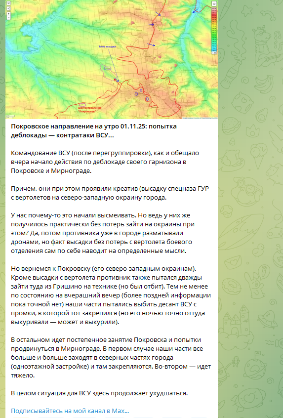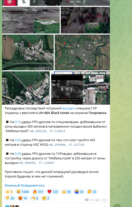 В том же канале выдвигается предположение, что под Покровск прилетали два "Чёрных ястреба" и зон высадки десанта было тоже две.