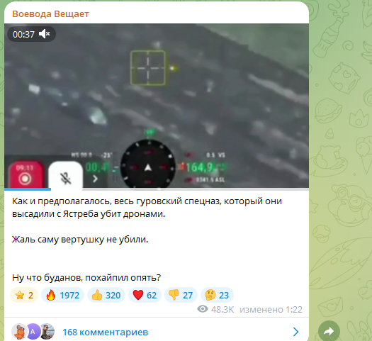 Со вчерашнего вечера околовоенные паблики гудят: появление вертолёта "Чёрный ястреб" под Покровском стало неприятным сюрпризом для наших. Вражеская вертушка смогла беспрепятственно прилететь и улететь, да ещё и высадив особый десант - спецназ ГУР. Другое дело, что для украинской стороны последствия этой "спецоперации" были страшные: всех элитных боевиков в итоге ликвидировали в течение последующих пары часов. "Ну что, Буданов*, похайпил опять?" - главе ГУР напомнили, как он уже кидал элиту на убой ради бессмысленных пиар-акций. Предполагается, что на сей раз планировался "антикриз" - спецназовцы должны были воткнуть и сфотографировать украинский флаг у Покровска, дабы опровергнуть вести про котёл, в который там попали ВСУ.