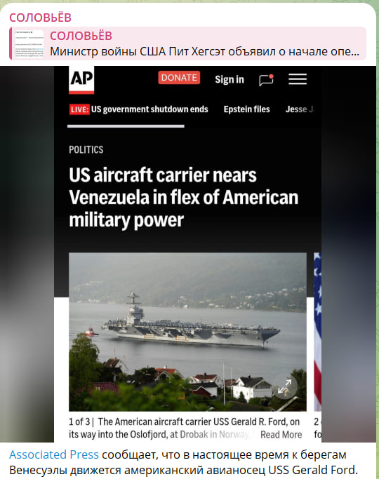 По данным Associated Press, после заявления главы Пентагона к берегам Венесуэлы отравился самый современный американский авианосец USS Gerald Ford - армия США окажется у госграницы через несколько дней.