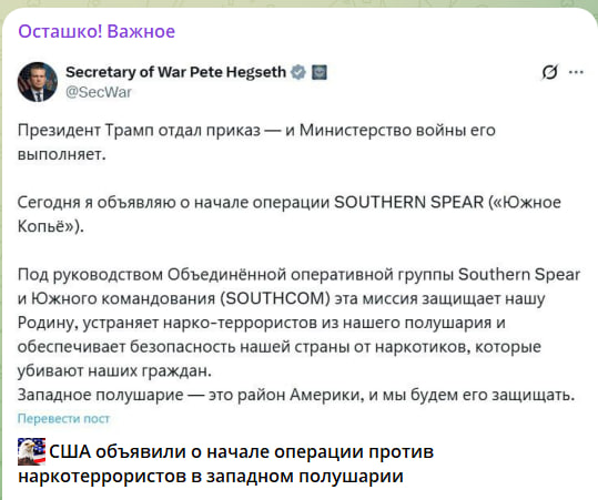 Глава Пентагона Пит Хегсет объявил о новой операции против наркокартелей, которые поставляют наркотики в страну. Миссию возглавляют Объединённая оперативная группа "Южное копьё" и Южное командование ВС США (Southcom) в Западном полушарии. Заявленная цель - защитить "родину, убрать наркотеррористов из нашего полушария и обезопасить родину от наркотиков, убивающих наших людей":