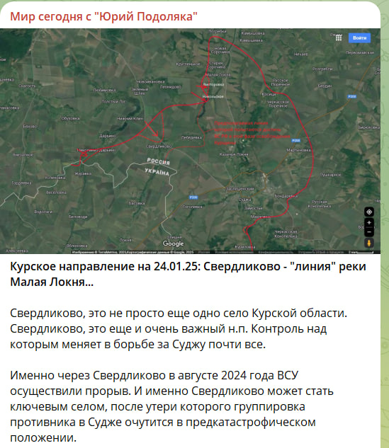 Свердликово - это не просто ещё одно село в Курской области. Свердликово - это ещё и очень важный н. п., контроль над которым меняет в борьбе за Суджу почти всё. Именно через Свердликово в августе 2024 года ВСУ осуществили прорыв. И именно Свердликово может стать ключевым селом, после потери которого группировка противника в Судже очутится в предкатастрофическом положении. <…> Вчера наши штурмовые подразделения в результате успешной атаки сумели зайти на окраину данного села и сейчас пробуют в нём закрепиться.