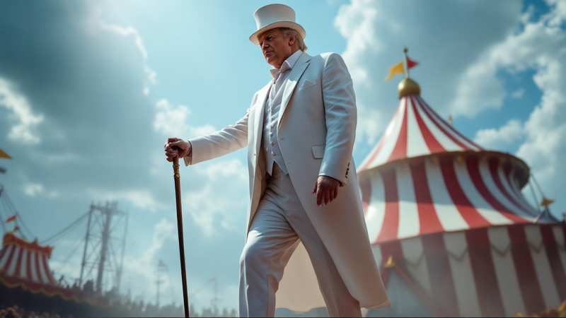 Примечательно отсутствие европейских лидеров на переднем плане новой обложки. Вместо этого там изображены два противоборствующих лагеря. В первом - Владимир Путин и Си Цзиньпин. Во втором - Дональд Трамп и Владимир Зеленский за его спиной. Лица нарисованы схематично, что подчёркивает: важна не отдельная личность, а представитель государства. Интересно, что Зеленский изображён в углу, окружённый взрывами, что может символизировать ослабление его позиций и возможное изменение украинской повестки. Внимание привлекает торт с тремя свечками, приуроченный к 250-летию США. Над тортом - синяя рука статуи Свободы в наручниках, явно указывающая на ограничение гражданских свобод.
