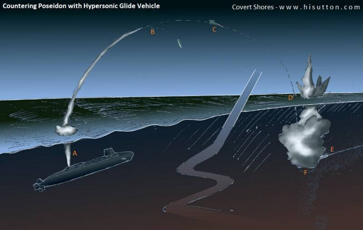 Нетривиальная схема с подключением атомной подводной лодки и гиперзвуковой ракеты, доставляющей в точку перехвата ядерный заряд. Источник: hisutton.com