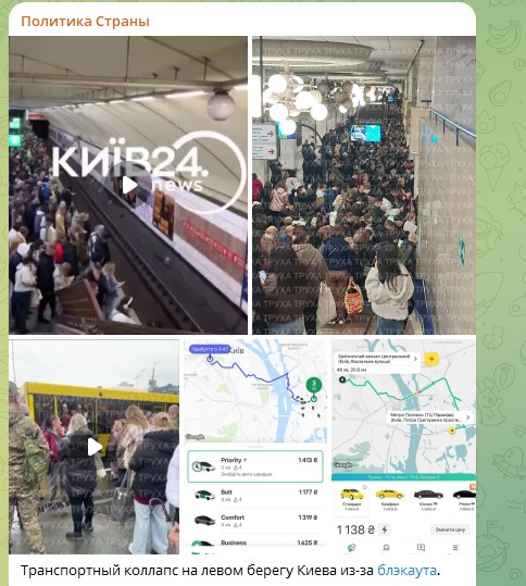 Тем временем в Киеве на левом берегу с самого утра транспортный коллапс: метро работает с перебоями, цены на такси резко подскочили - добраться до правого берега стоит от тысячи гривен, в метро и наземном транспорте давка, пишет издание "Страна". Кроме того, на том же левом берегу начались проблемы не только со светом, но и с водой и мобильной связью.