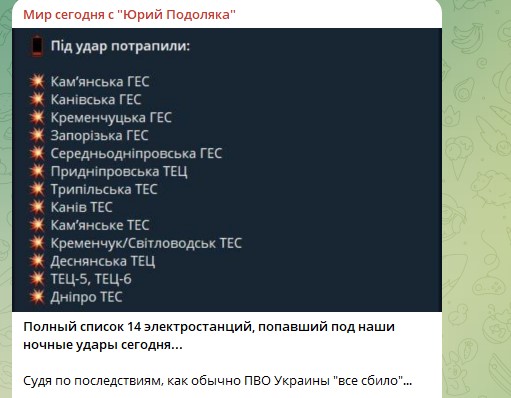 Тем временем военный блогер Юрий Подоляка разместил в своём телеграм-канале особый список - все поражённые минувшей ночью ТЭЦ: