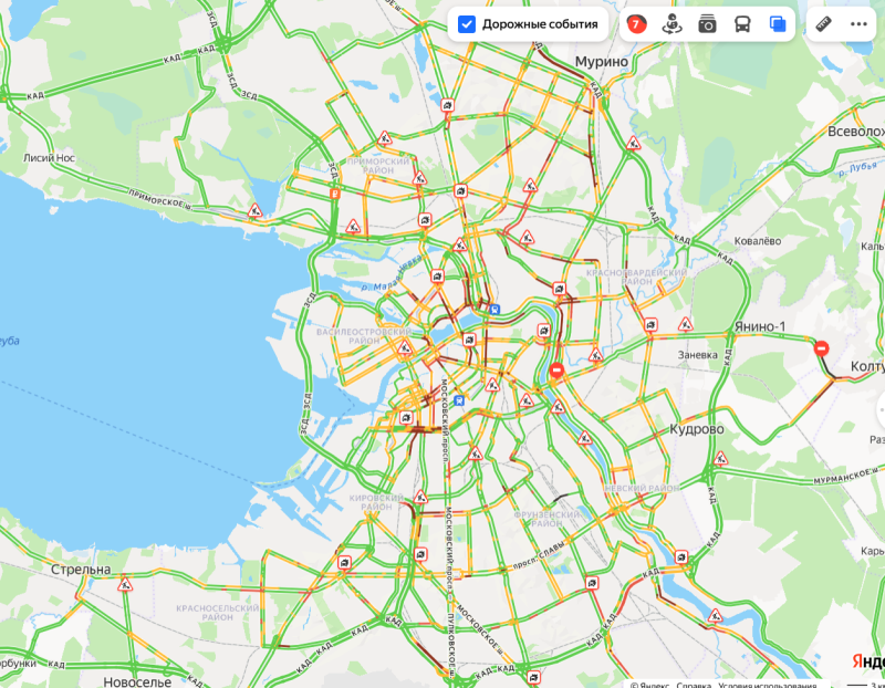 Дорожная ситуация в Петербурге днём 27 января резко осложнилась: уровень загруженности улиц вырос до значений, характерных для вечернего часа пик. К традиционным заторам на въезд в город добавились масштабные пробки на выезд — автомобилисты ожидают открытия движения по КАД.