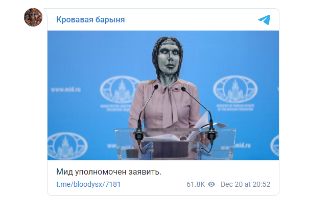 Ксения Собчак разместила в своём Telegram-канале коллаж, где к телу официального представителя МИД России Марии Захаровой прилеплена голова памятника Алёнке - монумента, недавно установленного в честь 250-летия села Новая Алёновка. "МИД уполномочен заявить" - подписала художество телеведущая.