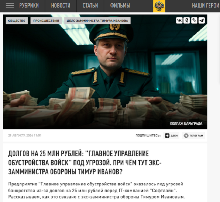 Долгов на 25 млн рублей: "Главное управление обустройства войск" под угрозой. При чём тут экс-замминистра обороны Тимур Иванов? Фото Царьграда