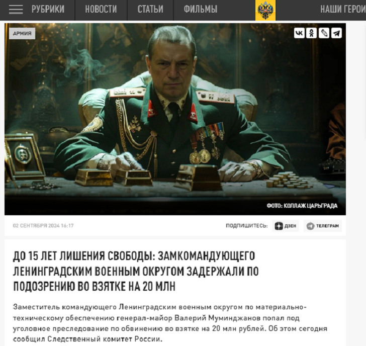 До 15 лет лишения свободы: замкомандующего Ленинградским военным округом задержали по подозрению во взятке на 20 млн Фото: Царьград