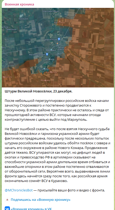 Русские бойцы за последние два дня заметно продвинулись - очевидно, впереди окончательное освобождение города. Самые ожесточённые бои идут между Зелёновкой и Улуклы (там армия России пытается перерезать физически последнюю дорогу из Запорожья с юга), в районе Дачного и Петропавловки (занять её важно для дальнейшего продвижения к Андреевке).