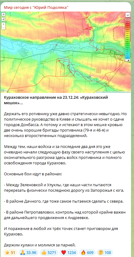 Сегодня утром стало известно, что русская армия окружила важнейший логистический узел боевиков в Курахово. Даже командование ВСУ признаёт, что потеряло ключевой населённый пункт и ещё несколько важных для противника посёлков. Появилась новая стратегическая задача для русских - освобождение Покровска, от которого зависит вся промышленность Украины.