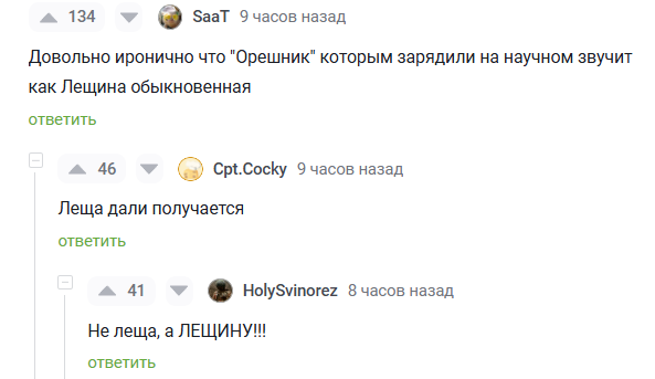Тем временем пользователи популярного портала "Пикабу" указали на нечто ироничное в названии "Орешника". Растение-то называется лещиной! С точки зрения ботаники. Правильно звучит как-то так: Лещи́на обыкнове́нная, или Оре́шник, или Лесно́й оре́х (лат. Córylus avellána).