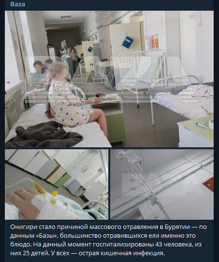 Массовое отравление случилось в Бурятии: 43 человека попали в больницу, из них 21 - дети в возрасте от семи до 15 лет. Один ребёнок в реанимации в тяжёлом состоянии, пишет телеграм-канал SHOT.