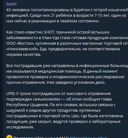 Земляки, информирую вас о ситуации по вспышке острой кишечной инфекции. По данным Роспотребнадзора, заболевание связано с продукцией одной из торговых сетей Бурятии (шаурма и ряд других наименований). На данный момент зарегистрировано 43 случая, в том числе 21 ребенок, у троих пациентов подтверждён сальмонеллёз,