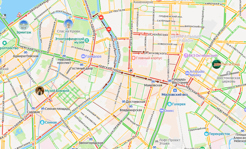 Последствия возгорания ощутили на себе тысячи горожан и туристов: движение на Невском проспекте полностью остановлено от станции метро "Невский проспект" до "Площади Восстания". Серьёзные 5-бальные пробки образовались также на Лиговском и Садовой улицах.
