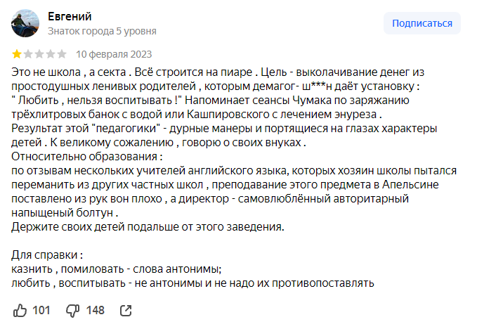 Знания дают очень средненько, домашек нет, разводилово от Зицера за ваши большие деньги. В школе дети всегда голодные, и это при очень высокой стоимости обучения. Дают печенье и 1 яблоко. Гулять совершенно негде — школа находится в промзоне, и на гулянье маленький кусочек территории, отделенный забором. Дима Зицер открыто поддерживает и финансирует [небратьев]. Так что, дорогие родители, подумайте, на что идут ваши деньги.