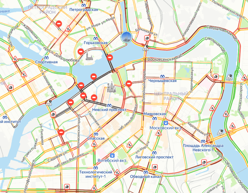 На Литейном проспекте, ведущем к мосту с таким же названием, наблюдается почти полная остановка движения. Уровень загруженности оценивается в 10 баллов, что на 3 балла превышает обычный показатель.