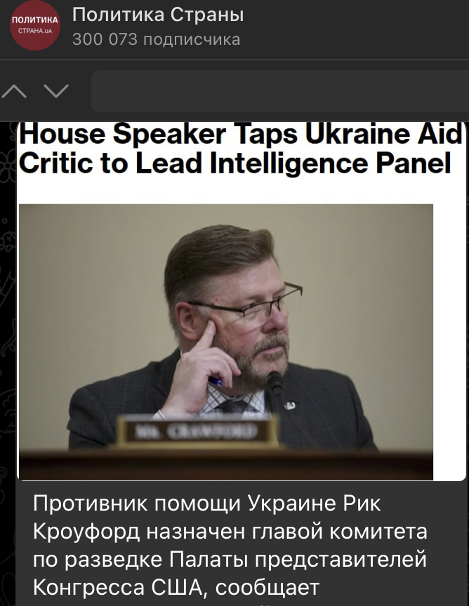 Рик Кроуфорд, ярый противник выделения помощи Украине, назначен главой комитета по разведке Палаты представителей Конгресса США, сообщает Bloomberg, ссылаясь на свои источники. Издание напоминает, что в апреле 2024 года Кроуфорд проголосовал против пакета помощи Украине на сумму 60,8 миллиарда долларов.