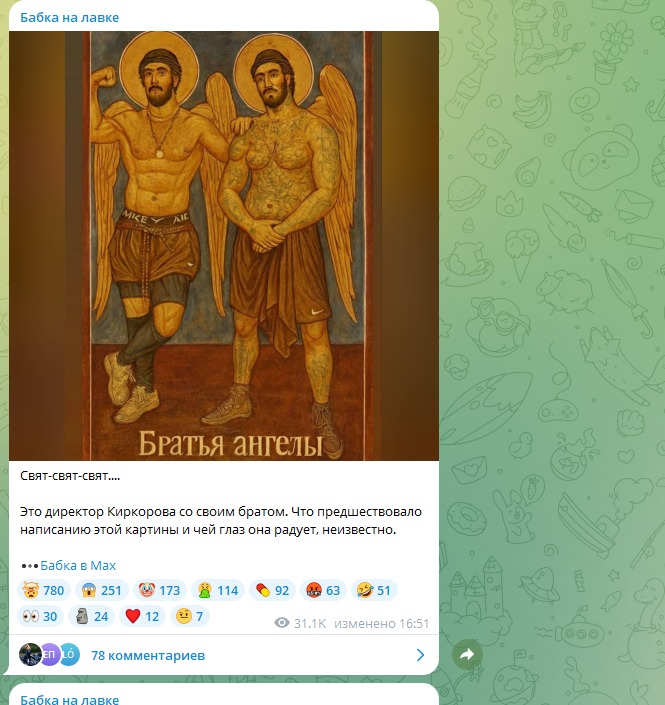 В Сети обсуждают очень странный факт о Филиппе Киркорове. Вернее, о его директоре Максиме Ситнике. В телеграм-каналах выложили странную картину, стилизованную… под икону. А в образе ангелов изображены, как утверждается, вышеупомянутый директор и его брат. Комментаторы в замешательстве: уж не поэтому ли Киркоров топтал крест на одном из своих концертов? Может быть, отношение к Православию в это команде весьма, мягко говоря, специфичное в целом?
